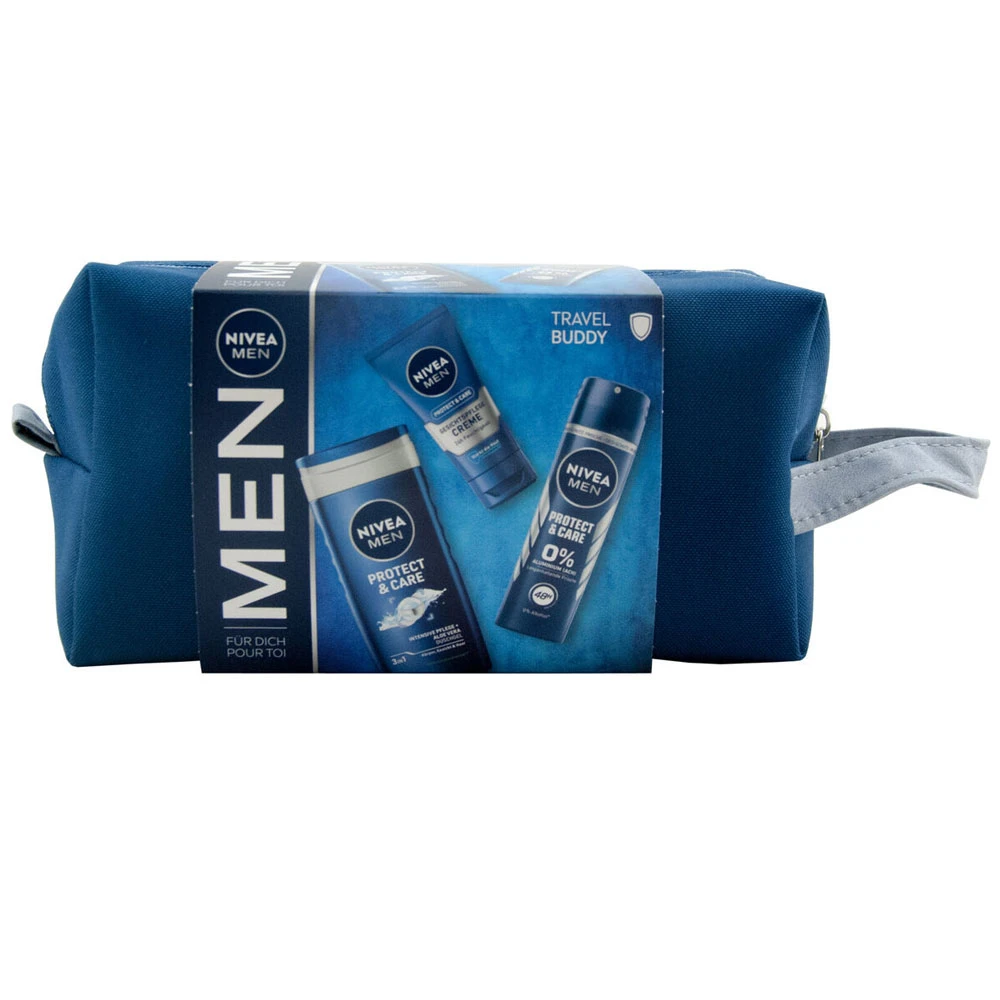 Borseta cadou Nivea Men Travel Buddy contine deodorant 150ml, gel de dus 250ml si crema 75ml, perfecta pentru calatorii.