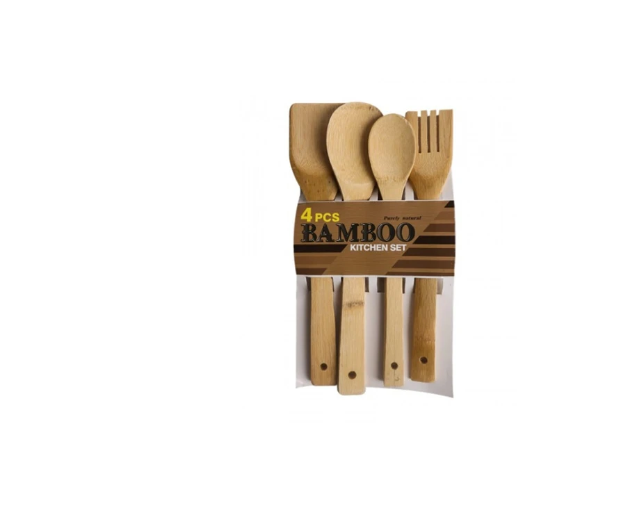 Set de 4 ustensile pentru bucătărie din bambus natural, durabil și prietenos cu vasele de gătit. Ideal pentru preparate zilnice, ușor de utilizat și de întreținut, oferind un aspect elegant și funcțional bucătăriei tale.